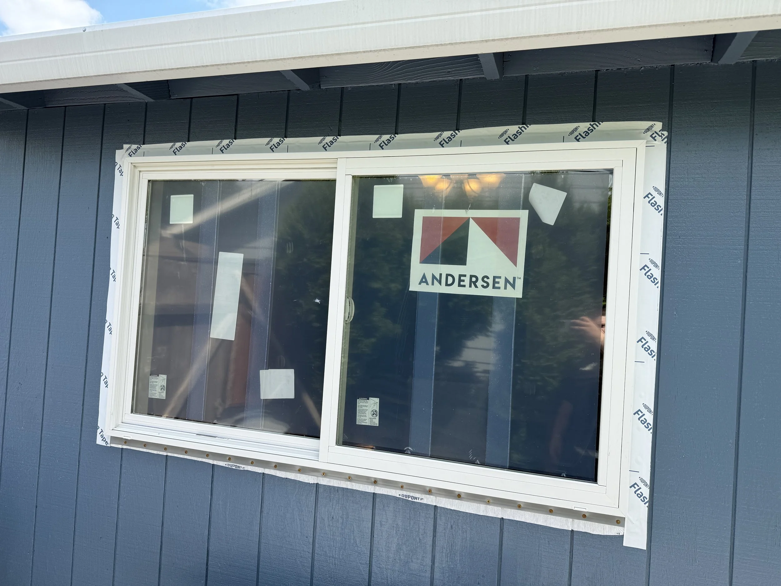 The next step is to prep the opening and install the window. This consists of a series of flexible flashing membranes, as well as a rigid, metal flashing. These are layered from the bottom to the top, to account for water running down a wall, not exposing seams to failure from above. The nailing flange of the window is then wrapped with an additional layer of flexible membrane flashing.
